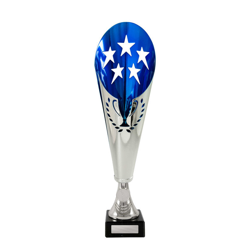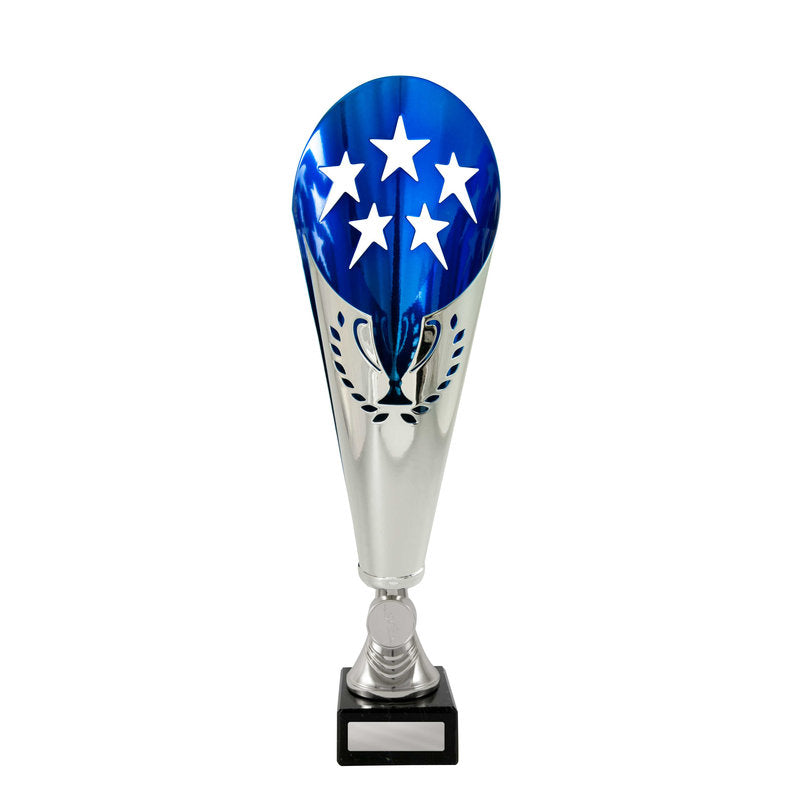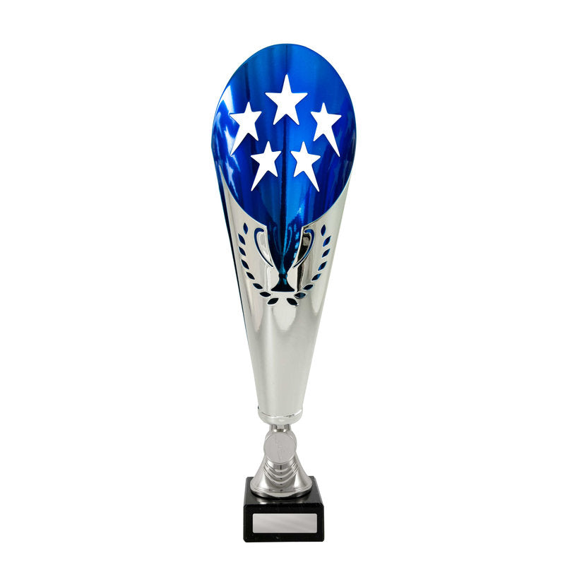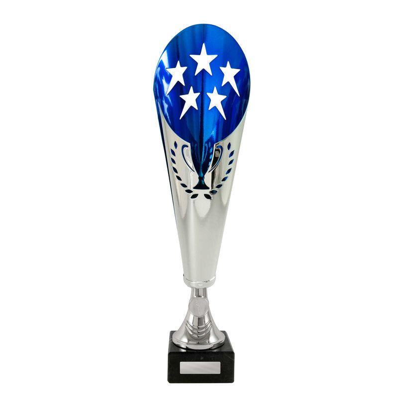 This award is part of the 2025 Evaton Range, exclusively at Brighton Trophy Centre. Colour: Silver-Blue. Material: Metal-Plastic-Marble. Centre Holder: 25. Height: 310.0mm. Perfect for celebrating achievements in Metal Cups events. Engraving available – contact us to personalise your award.
