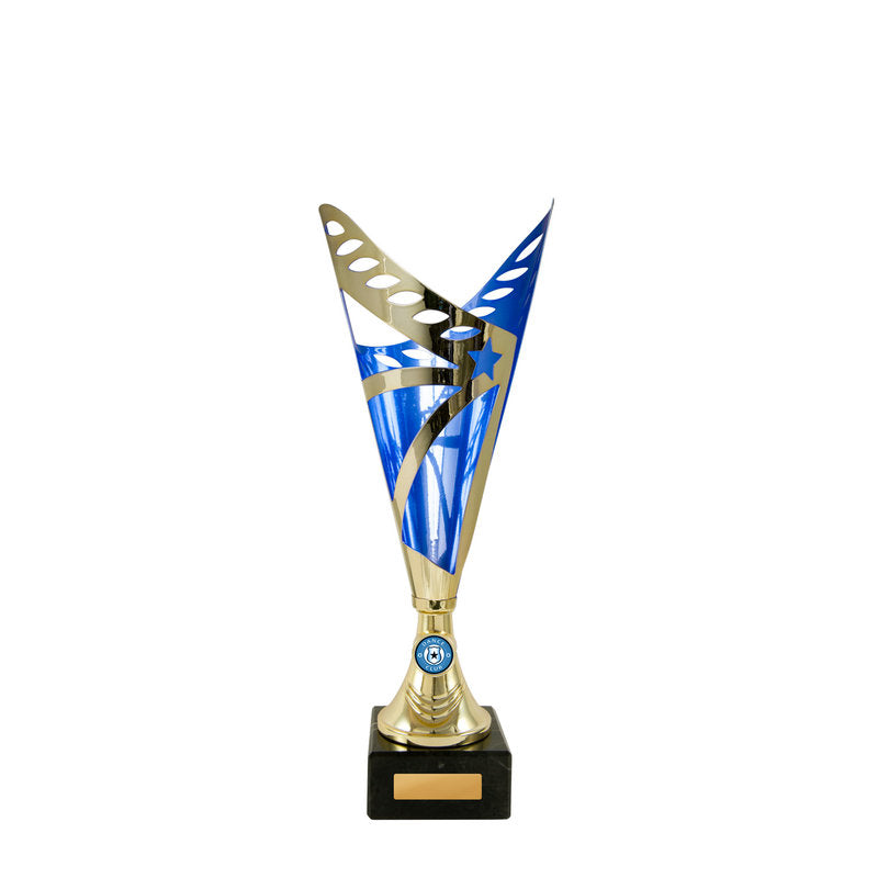 This award is part of the 2025 Evaton Range, exclusively at Brighton Trophy Centre. Colour: Gold-Blue. Material: Metal-Plastic-Marble. Centre Holder: 25. Height: 330.0mm. Perfect for celebrating achievements in Metal Cups events. Engraving available – contact us to personalise your award.