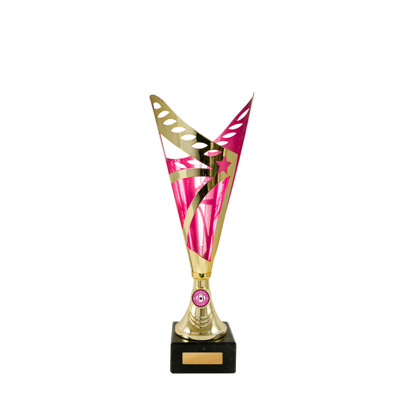 This award is part of the 2025 Evaton Range, exclusively at Brighton Trophy Centre. Colour: Gold-Pink. Material: Metal-Plastic-Marble. Centre Holder: 25. Height: 330.0mm. Perfect for celebrating achievements in Metal Cups events. Engraving available – contact us to personalise your award.