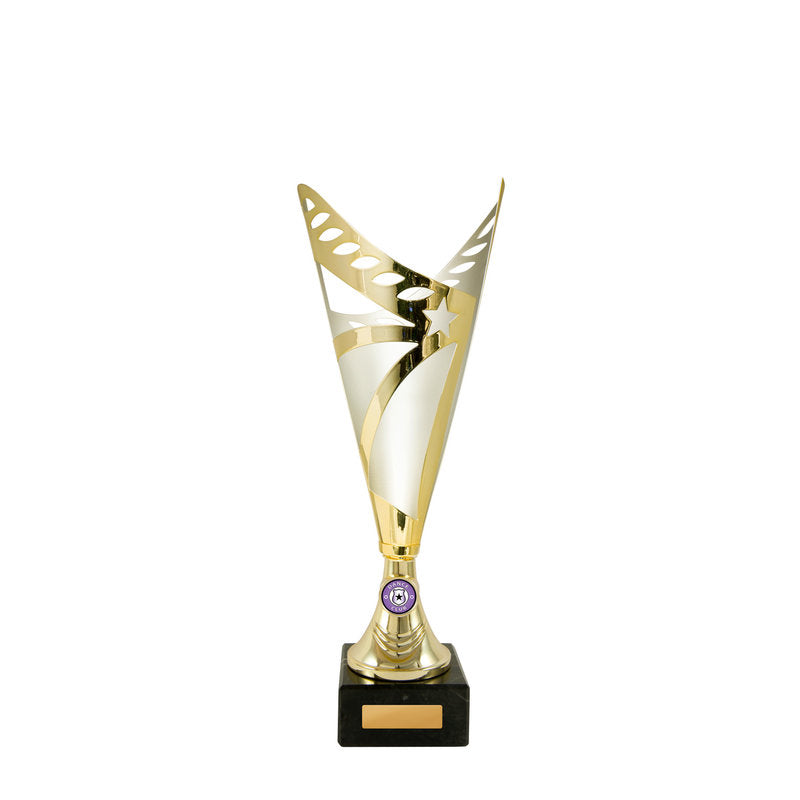 This award is part of the 2025 Evaton Range, exclusively at Brighton Trophy Centre. Colour: Gold-Silver. Material: Metal-Plastic-Marble. Centre Holder: 25. Height: 330.0mm. Perfect for celebrating achievements in Metal Cups events. Engraving available – contact us to personalise your award.