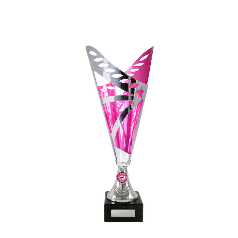 This award is part of the 2025 Evaton Range, exclusively at Brighton Trophy Centre. Colour: Silver-Pink. Material: Metal-Plastic-Marble. Centre Holder: 25. Height: 330.0mm. Perfect for celebrating achievements in Metal Cups events. Engraving available – contact us to personalise your award.