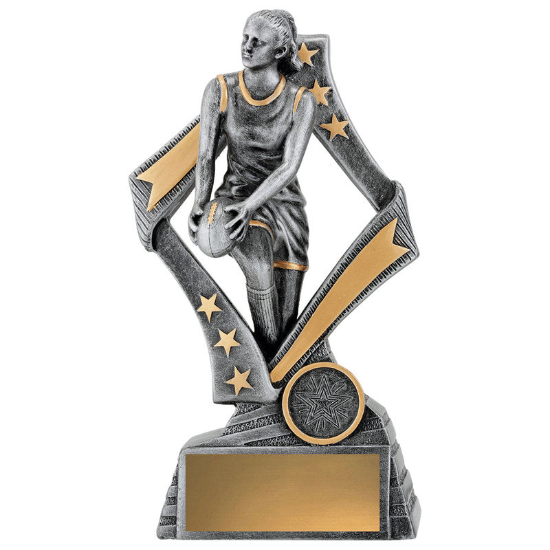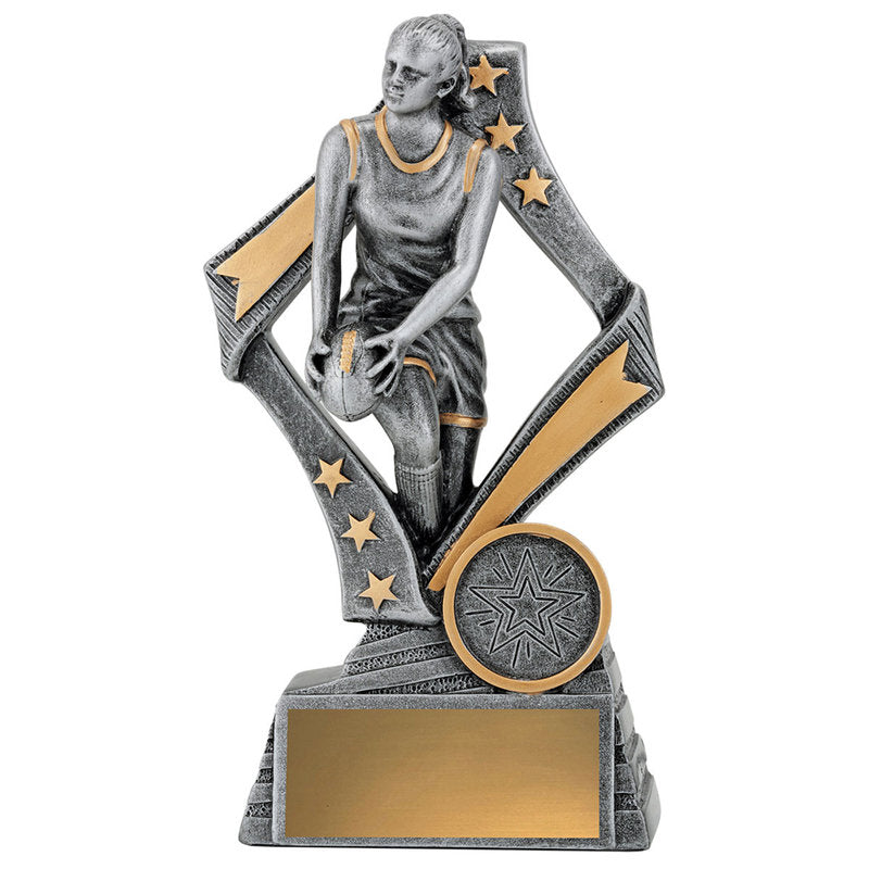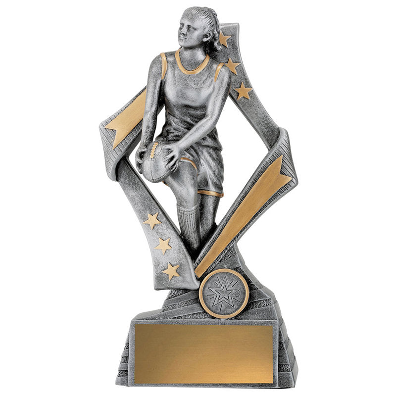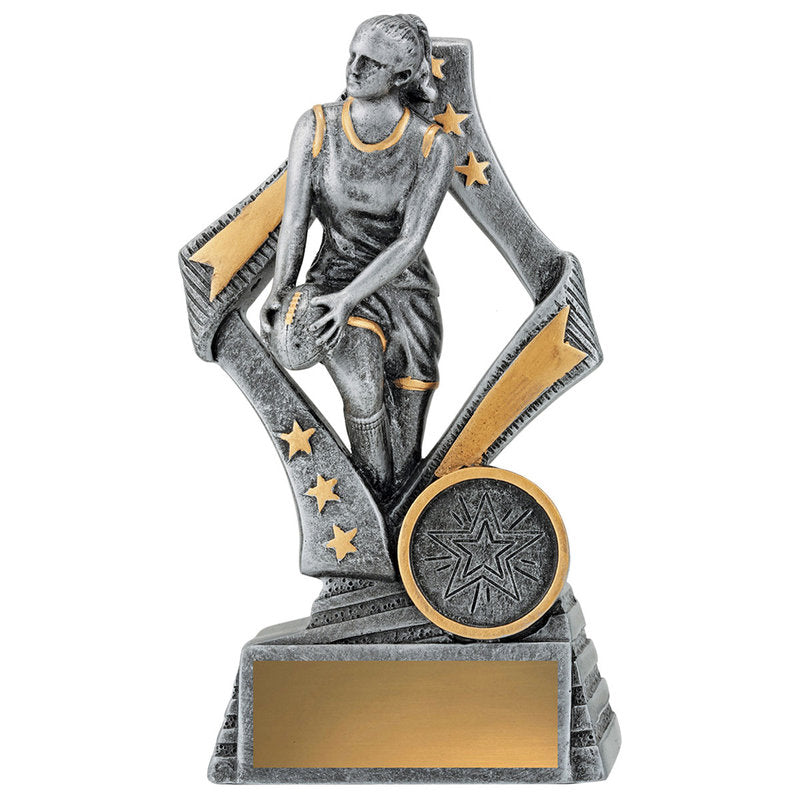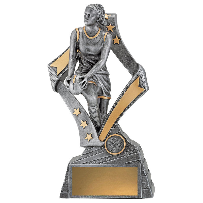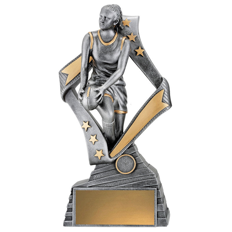 Dynamic footy trophies feature female player in action framed by a stylish star inspired design. Aussie rules trophies are finished in classic antique silver and gold. Perfect for various best player award categories.