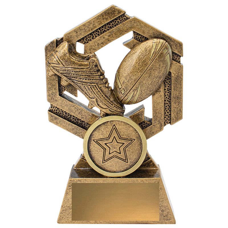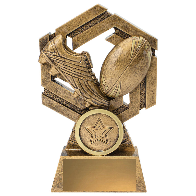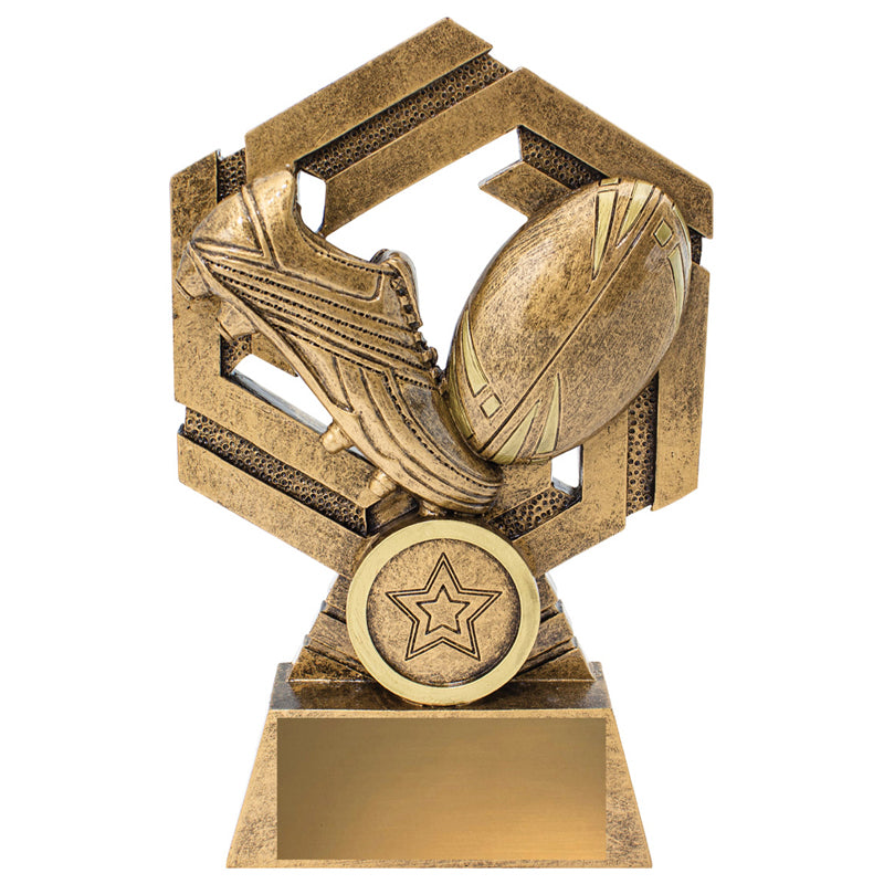 Eye-catching design that features classic league / union elements of boot and ball. Rugby league / union trophies finished in traditional antique gold. Available in 3 sizes with space for custom insert.