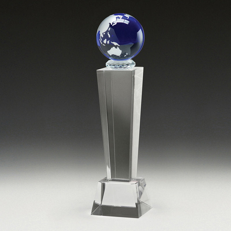 Crystal blue globes on top of crystal towers in a series of 2 sizes. An interesting and eye catching award trophy option for corporate success.