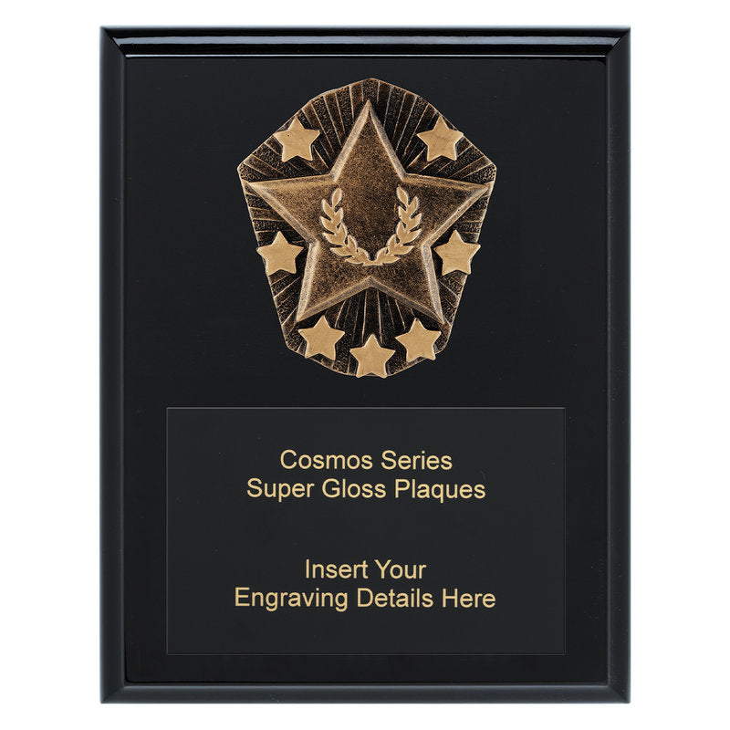 Range of super gloss plaques in classic black with brilliant Cosmos fronts and matte black engraving. Choose plaque - available in 3 sizes - to suit your sport or activity.