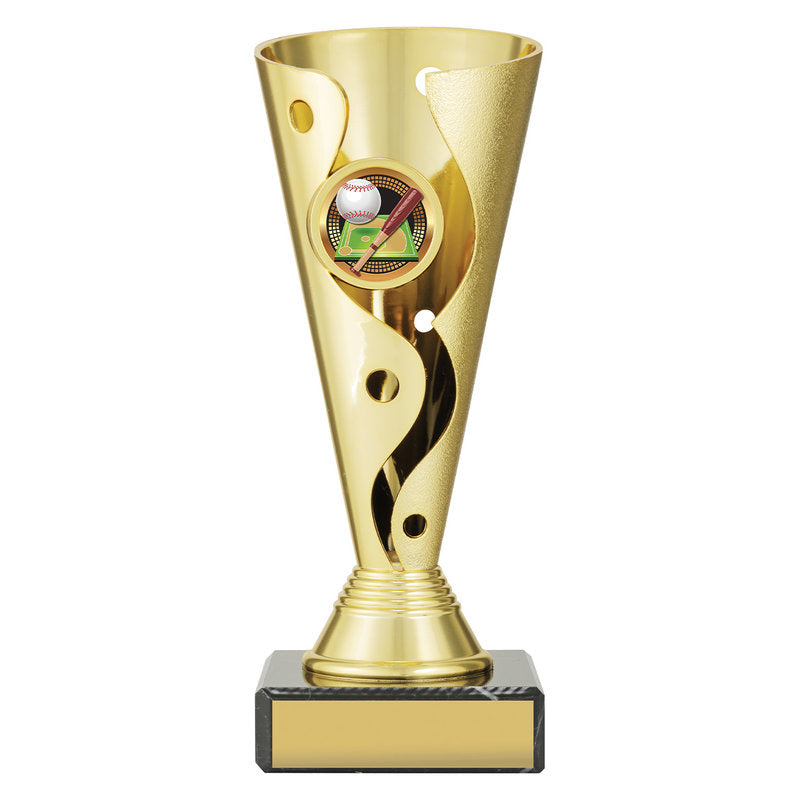 Carnival cups present a distinctive cup style trophy with attractive 3D design - on classic black marble base for your engraving - with brightly coloured insert for your sport. Trophies adaptable to your custom requirements.