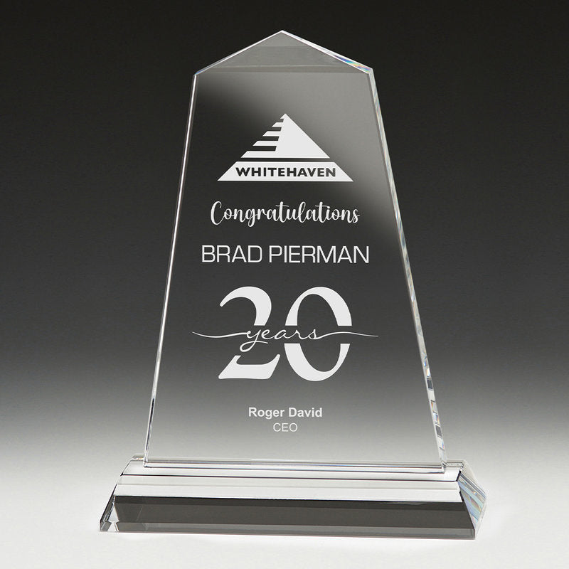 The Tribute Award series in clear, premium crystal presents an iconic pyramid design representative of achievement and success.