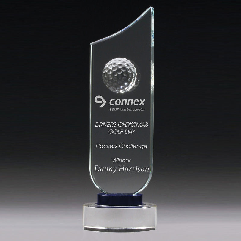 Golf Sabre Crystal award offers a prestige trophy option for your golf day or event, available in 3 sizes and supplied in gift presentation box. The design features a blue accent base and crystal golf ball decoration that elevates this award.