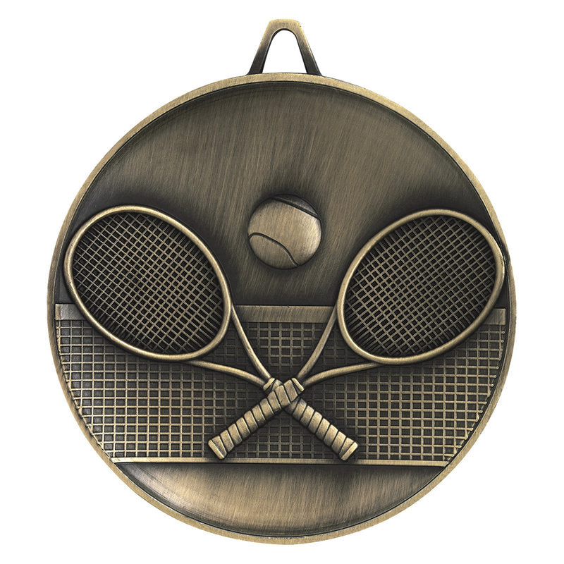 The Budget Heavyweight series offers prestige antique gold medals for a range of sports and activities at great value. The Tennis medal design features a theme of crossed tennis racquets against a net background.