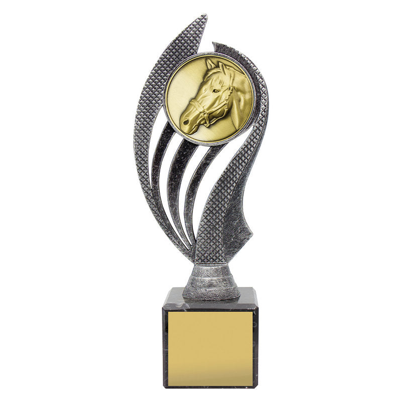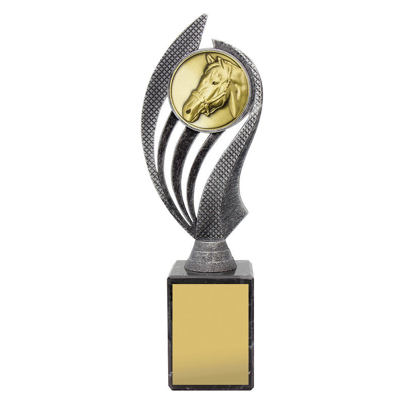 Husky series of trophies on premium black marble allows for different award options for your activity. Appealing antique silver and gold combination over number of sizes.