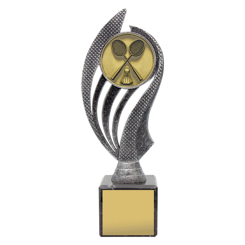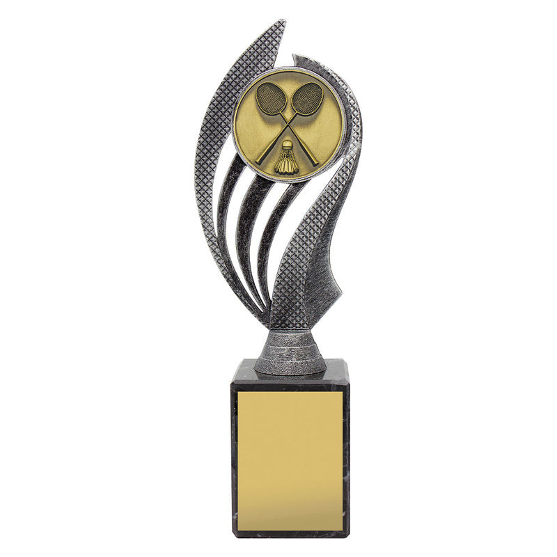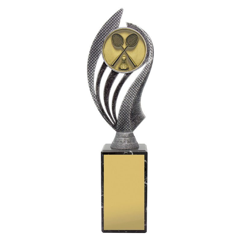 Husky series of trophies on premium black marble allows for different award options for your activity. Appealing antique silver and gold combination over number of sizes.