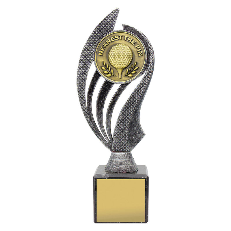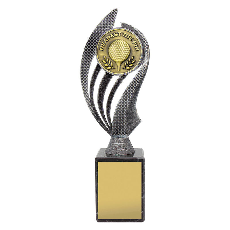 Husky series of trophies on premium black marble allows for different award options for your activity. Appealing antique silver and gold combination over number of sizes.