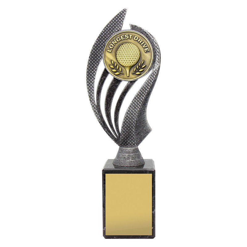 Husky series of trophies on premium black marble allows for different award options for your activity. Appealing antique silver and gold combination over number of sizes.