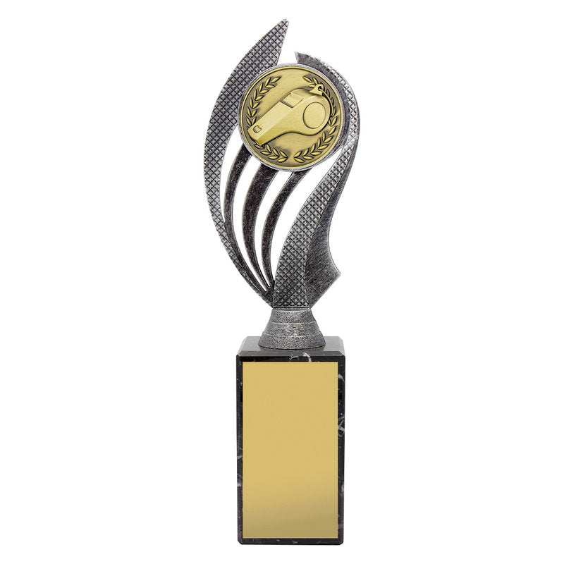 Husky series of trophies on premium black marble allows for different award options for your activity. Appealing antique silver and gold combination over number of sizes.