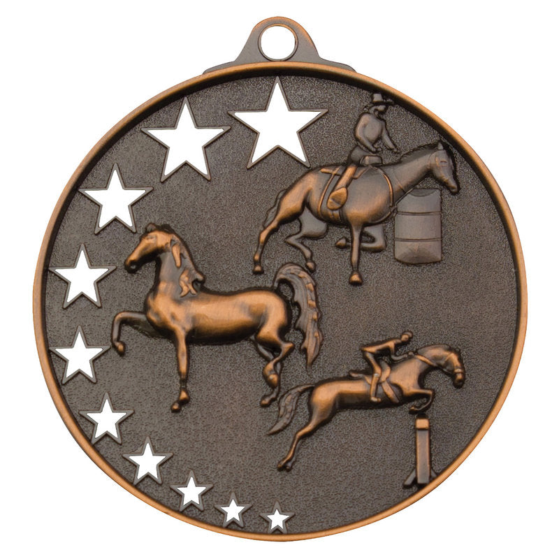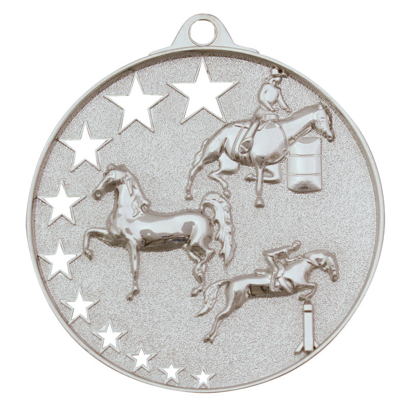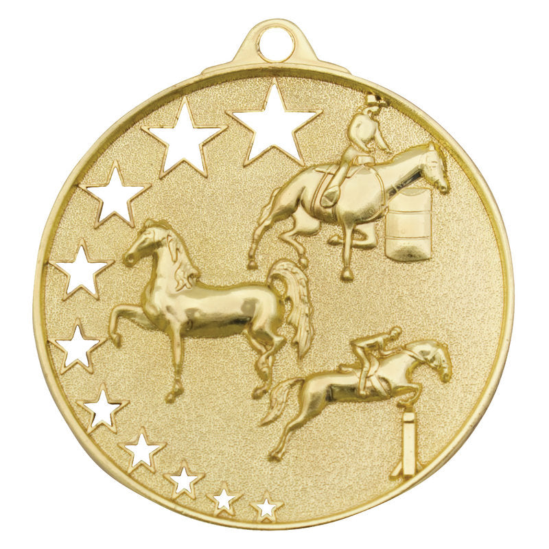 Bright gold, silver and bronze medals perfect for a range of Horse awards - design features different activities that may be appropriate. A popular medal series, the Star Series features a unique hollow multi-star design and extra thick edge. There is a rectangle panel on the back of each medal for your engraving.