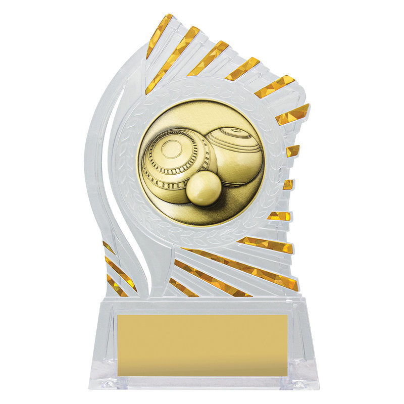 Exciting design of acrylic trophy showcases the gold theme for your sport or trophy. An affordable award with terrific space for your engraving.