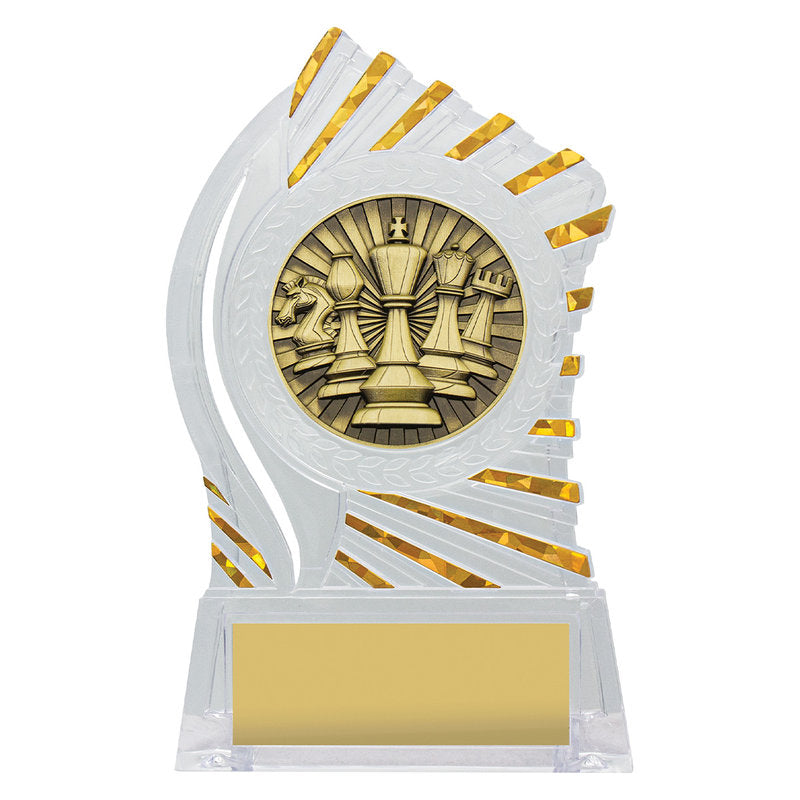 Exciting design of acrylic trophy showcases the gold theme for your sport or trophy. An affordable award with terrific space for your engraving.