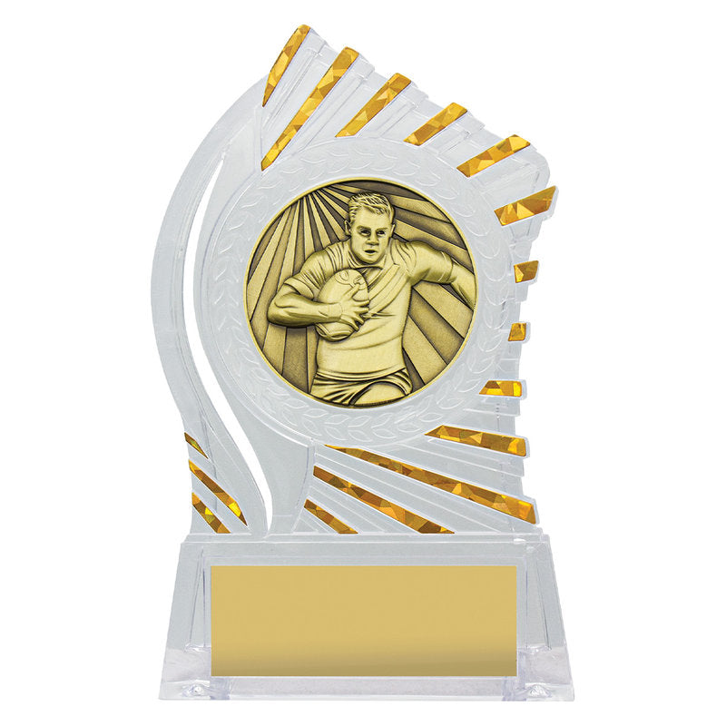 Exciting design of acrylic trophy showcases the gold theme for your sport or trophy. An affordable award with terrific space for your engraving.