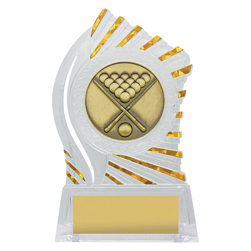 Exciting design of acrylic trophy showcases the gold theme for your sport or trophy. An affordable award with terrific space for your engraving.