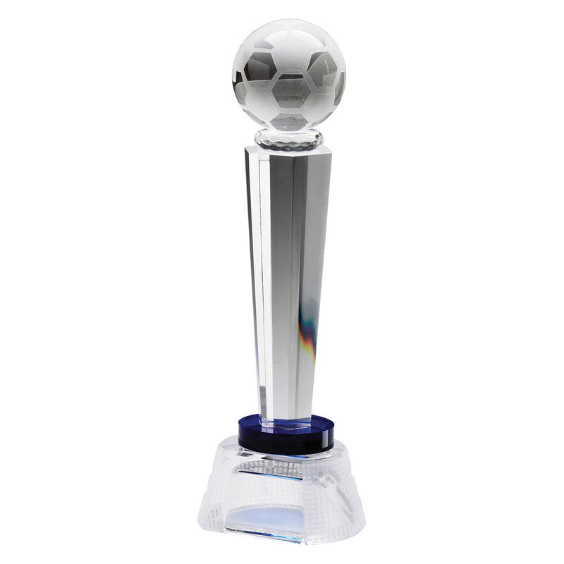 The Apollo Series for Football offers a brilliantly designed trophy in 2 sizes and supplied in presentation gift boxes. The crystal base features action silhouette designs, blue pedestal frames an elegant tower upon which sits a 3D crystal Football ball.