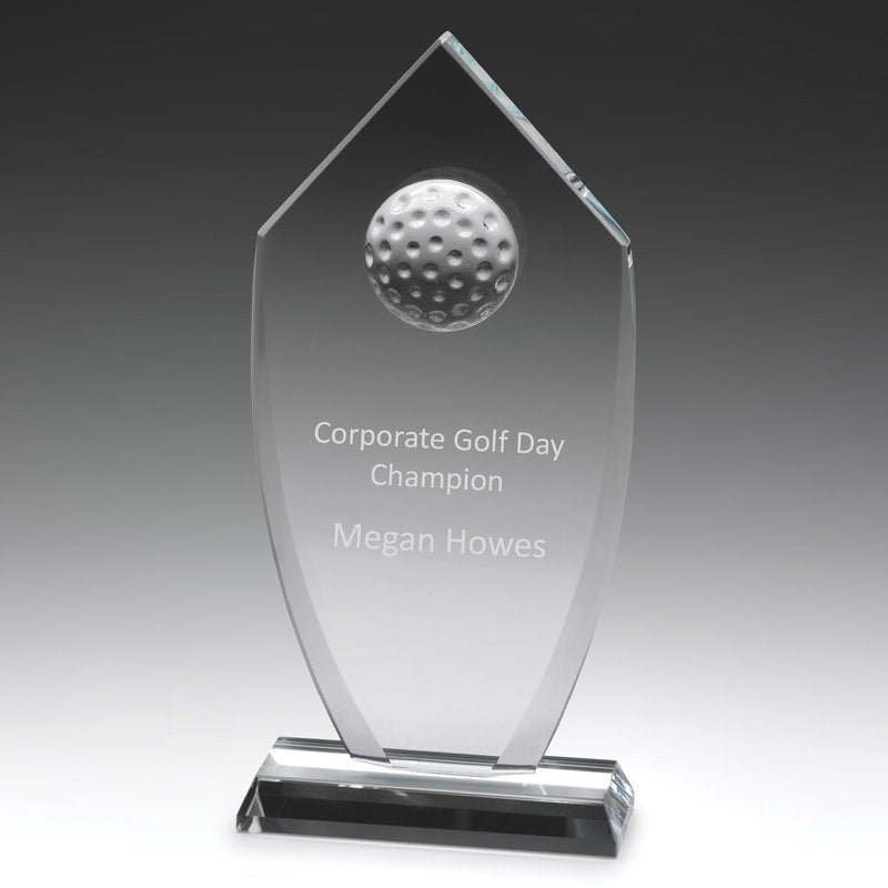 Affordable glass trophies in 2 sizes provide an effective award series for your golfing event or tournament. Awards feature quality clear glass - with detailed ball design - supplied in gift boxes.